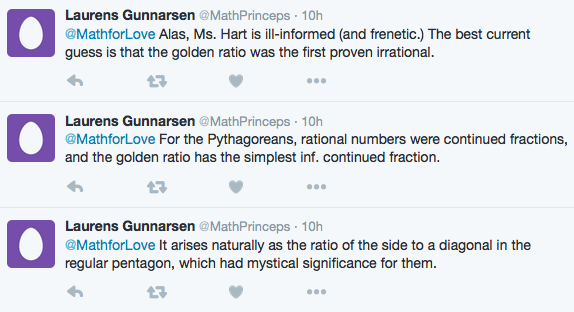 Especially because, as Donald found out, the Pythagoreans were all over pentagons and the golden ratio.