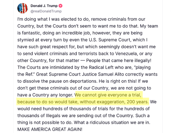 And to be clear, we might be off by a factor of 2 or more. Maybe it would take 2 years. Maybe 6 months. But we have a sense of scale here. And if the president said, “We cannot give everyone a trial because to do so would take, no exaggeration, 1 year,” it just rings different.