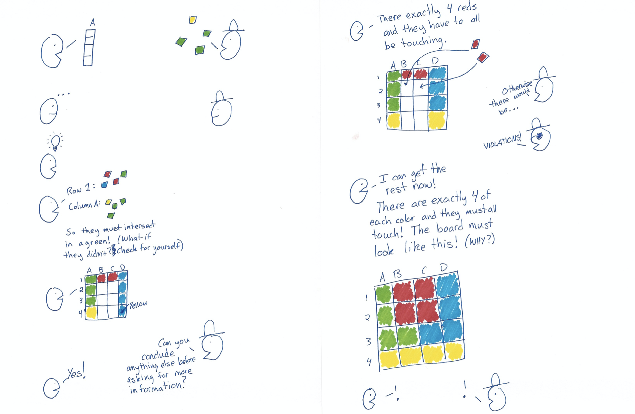 May 10, 2022A few years back a book publisher approached us to ask us to write a book of games. We went back and forth over various ideas, and finally started toying with the idea of using illustrations throughout a book that explained math games and their connection to pedagogy and also to big ideas in mathematics. Neither of us could draw, unfortunately, but Katherine could fake a kind of stick figure drawing that had a certain charisma. She whomped up these pages about a game we were playing a lot in classrooms at the time; Rainbow Logic.