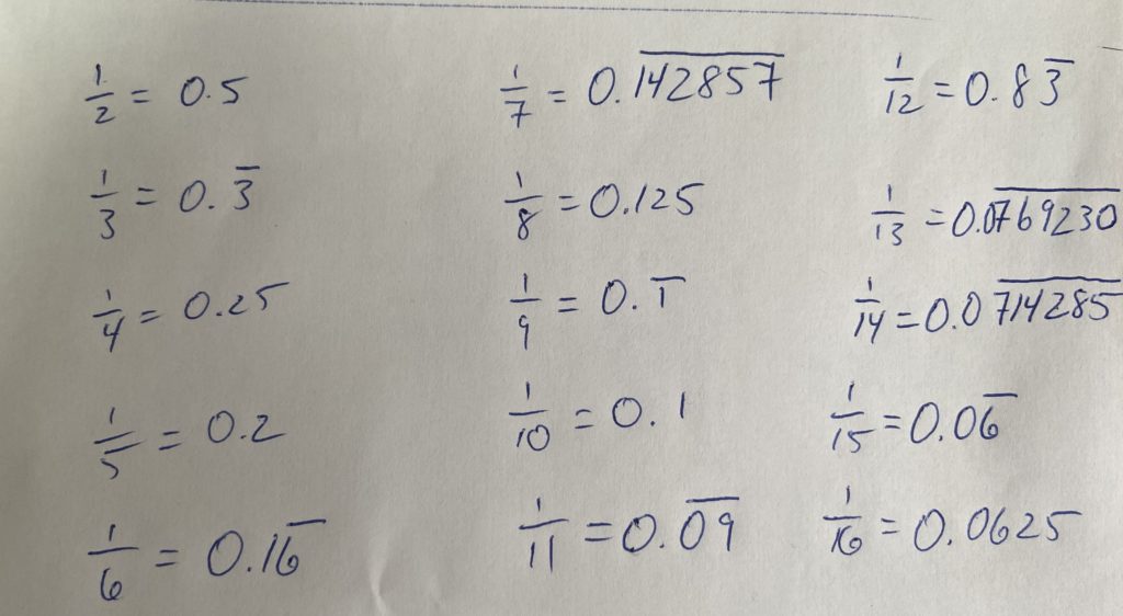 1/7 = 0.1428571429… This is what my calculator says. What’s going on?? Is the conjecture wrong? This is one of those moments where long division let’s us see what’s happening more clearly.