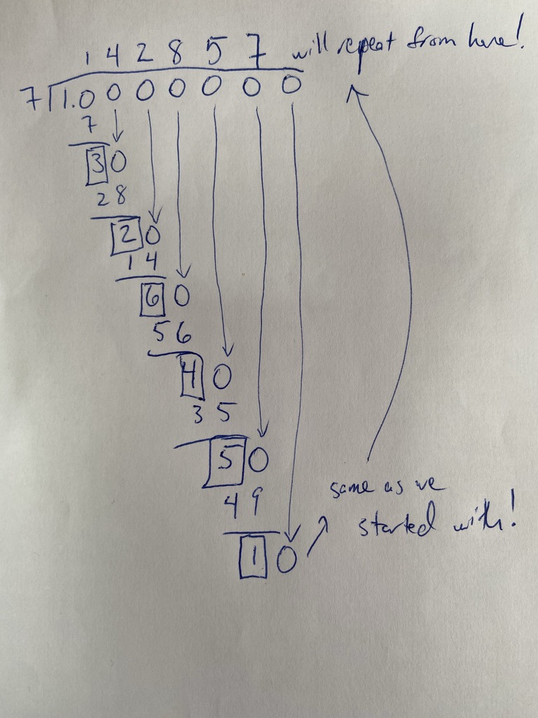 The possible remainders after we divide by 7 cycle through all the options from 1 to 6. Once that starts repeating, we know we’ll get the whole cycle of digits again. And again and again and again. (Digest that argument if you haven’t seen it before. It’s not obvious.) If you actually do the long division, you see that you’re going to be doing the same thing over and over. So the digits will repeat, but they’ll repeat in a six-digit interval.