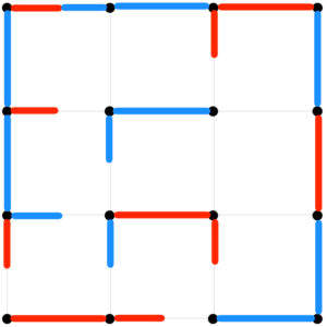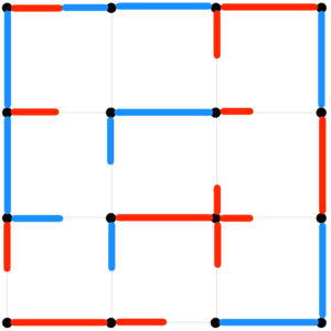 It’s Red’s turn. What move can Red make? Any full edge will give Blue a box to complete. But what about adding half-edges?
