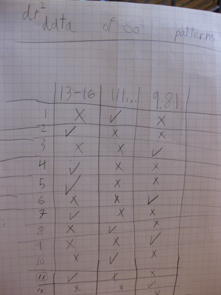 November 11, 2011One of my students yesterday shared an idea with me that he had kicking around in his head for a while, which he called continued multiplication. Essentially, he used the steps in a multiplication process as an iterative process to give him a new multiplication problem, which he would loop again and again. We clarified some of the rules (too complex to mention in full detail here), and I sent him home to investigate it further.