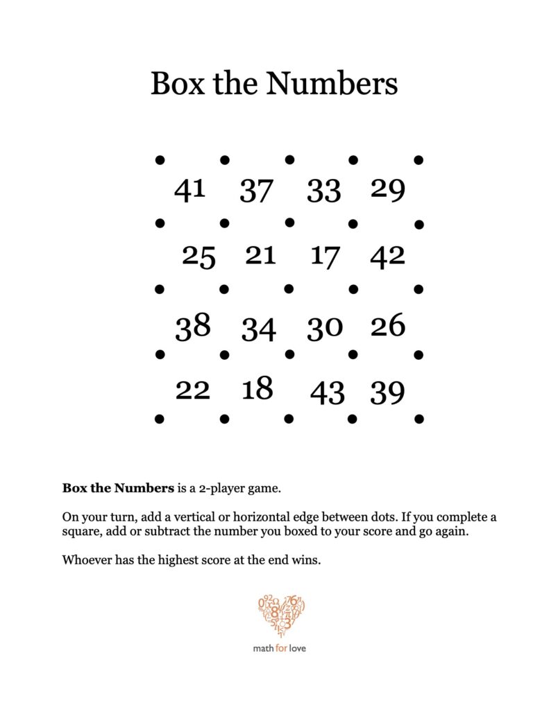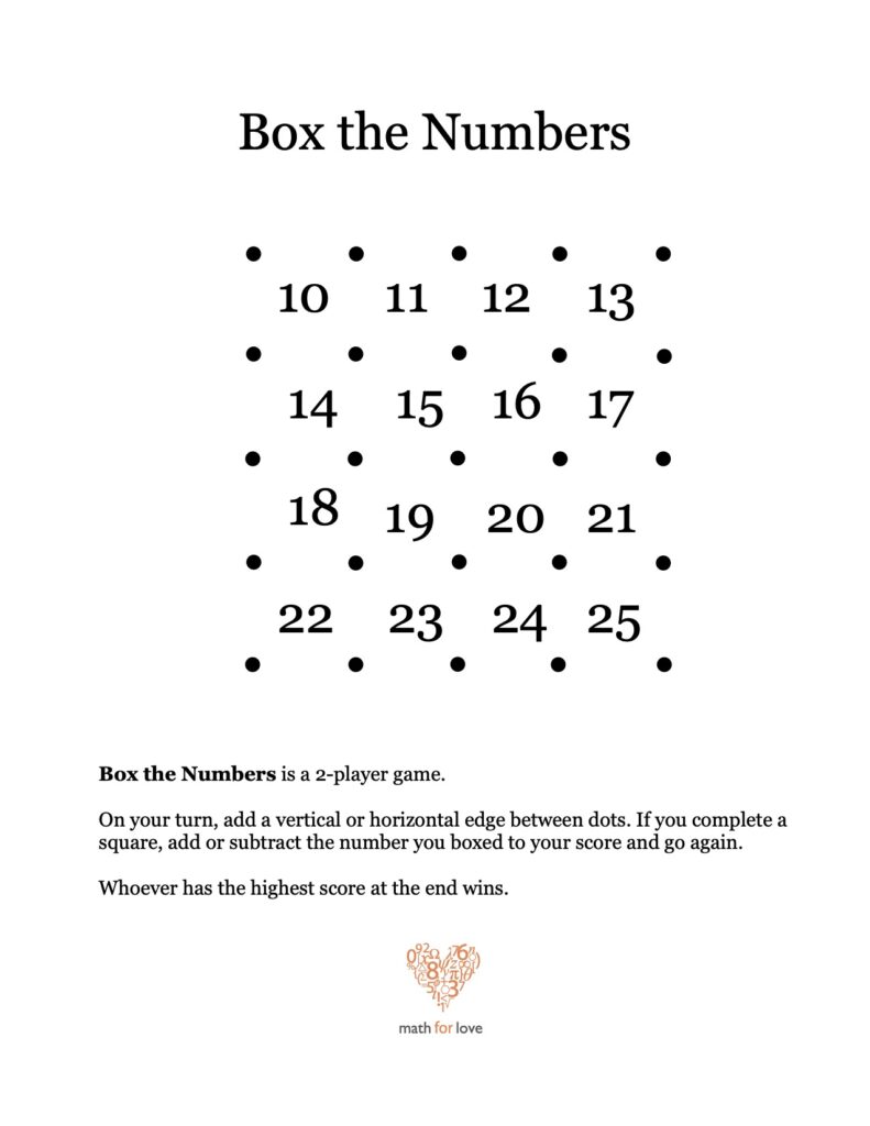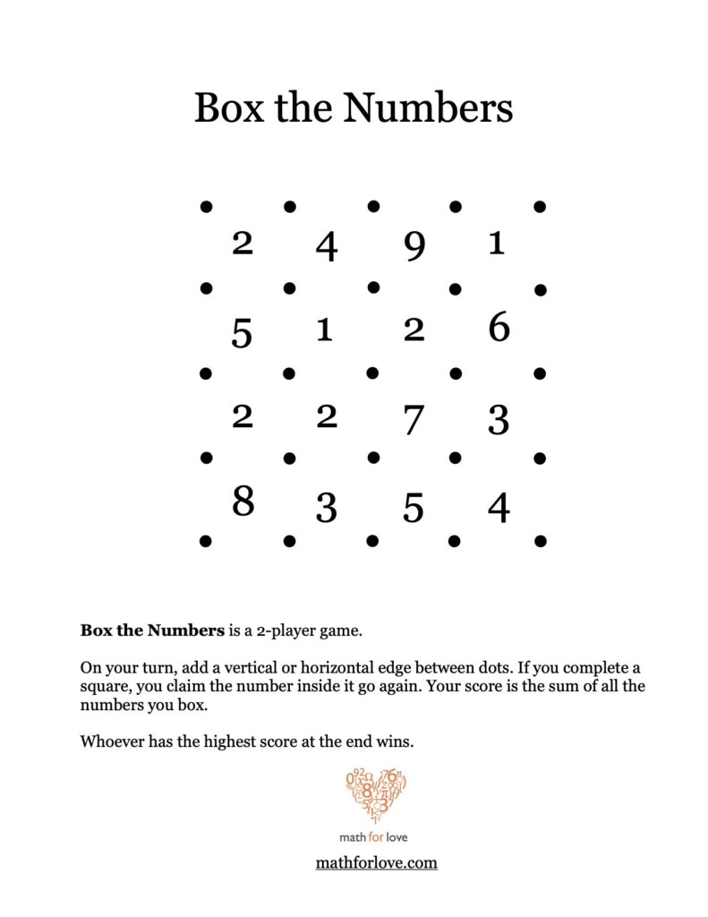 Box the Numbers is exactly like the classic game Dots and Boxes, except that when you complete a box, you don’t simply get a point. Instead, your score changes by whatever number you boxed.