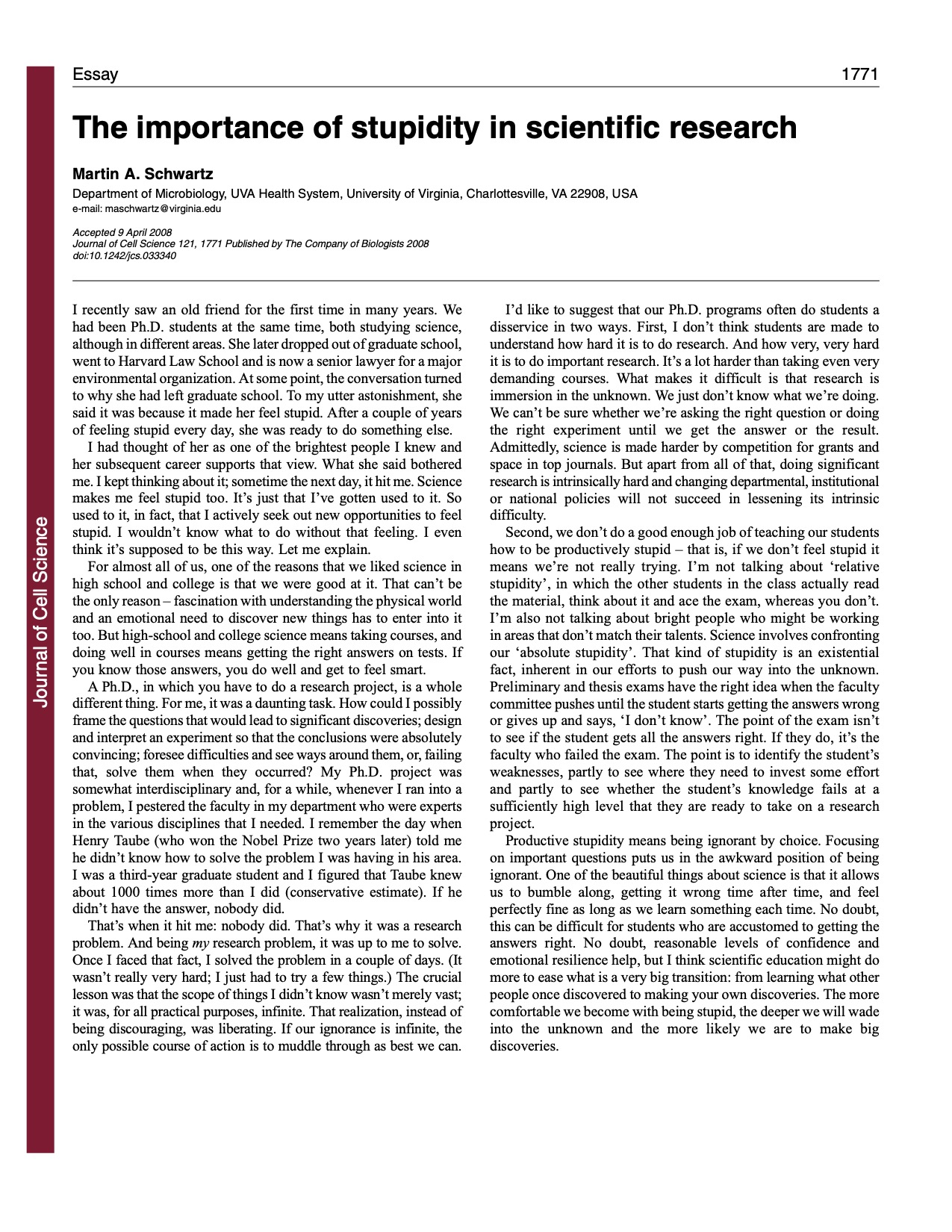 September 17, 2024The Importance of Stupidity in Scientific Research – published in 2008 in the Journal of Cell Science – is one of those wonderful essays that turns your understanding of “being smart” on its head. There are enough implications for education here that it’s worth reading the entire thing.
