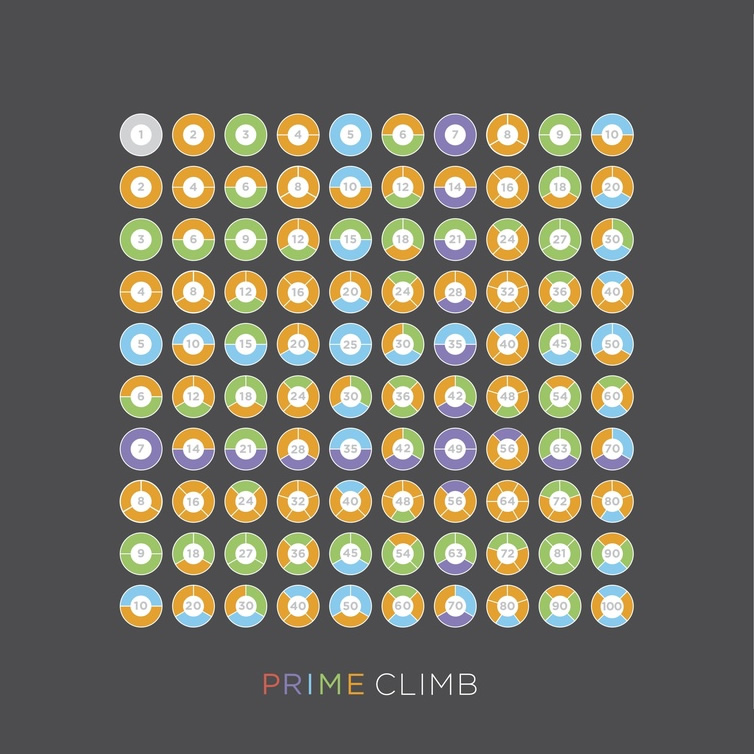 This gorgeous poster features the multiplication table with the Prime Climb coloration scheme. By coloring the prime factors 2, 3, 5, and 7, the patterns in this multiplication table jump off the page. A perfect touch for a classroom, or any environment that could use more beautiful mathematics in it.