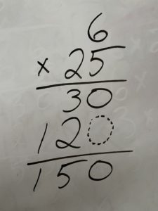 Let’s say you’re trying to solve 6 x 25 with your third or fourth grader. You want to help, so you show your child what you learned how to do. So maybe you set it up vertically.