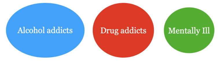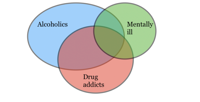 Probably the real picture looks something like a classic Venn diagram, with various overlaps. Going to the extremes of no overlap vs. all overlap, we get a sense of the range of possible percentages of homeless people with one or more of these problems. That range, if the original statistics were right, goes from 38% – 89%.