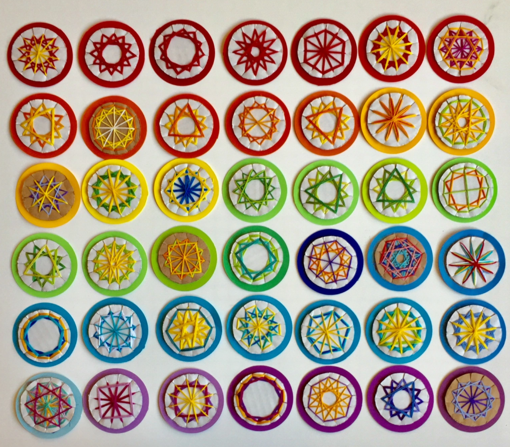 The craft part is less my specialty, but happily, the blog Math In Unexpected Places did a beautiful post on Star Polygons a few years ago, and everything you need to turn this into a craft project is there. The title of the blog post is Star-o-Rama (and how to make them). Image from that blog to whet your craft appetite is below!