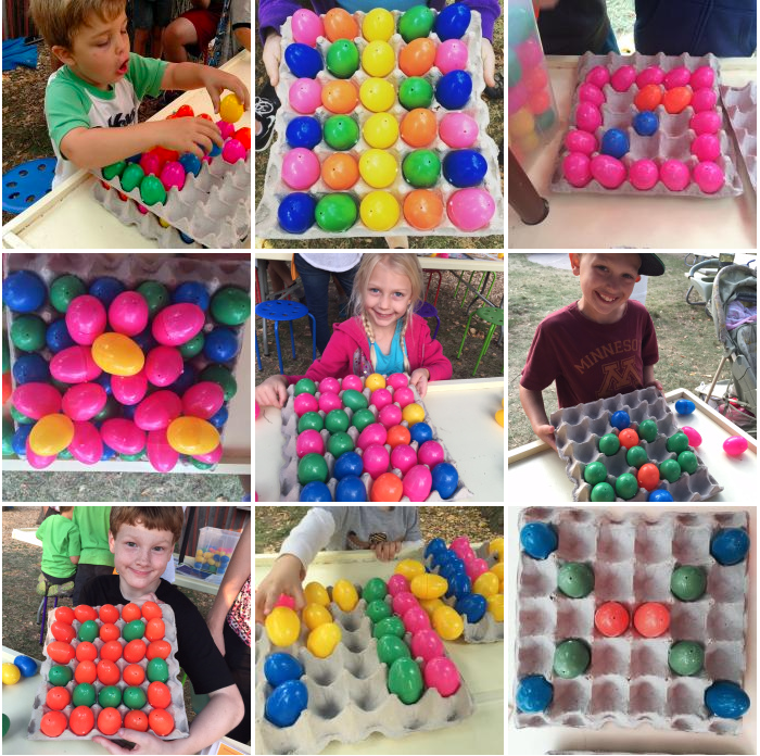 As for egg cartons, check out the patterns emerging from kids playing with colored plastic eggs and egg cartons at Math-on-a-Stick at the Minnesota State fair. (These taken from Christopher Danielson’s aptly titled blog post, Let the Children Play.)